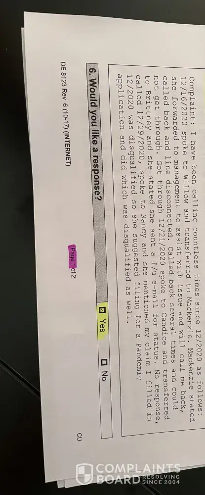 In December of 2020 I applied for unemployment benefits which I was denied for due to the reason of my termination and I already knew that I would be. I believe it was in January that I had received a letter from EDD stating that I was eligible for Pandemic benefits and that I did not need to do anything further it's automatic. So I waited and nothing so I contacted them again in March of 2021 by sending a message through my online account and received a response back on 03/03/21 stating that my claim had been processed and that I was already paid. I don't know who they paid because It was not me. So I sent them another message regarding the payment that they claimed that was sent to me back in March and no response period. I just recently sent them another message regarding the pandemic unemployment benefits on 07/29/21 and if I am eligible for it if I will be getting back pay and still no response. I have been unable to reach them by phone so filing a complaint is my last resort.
