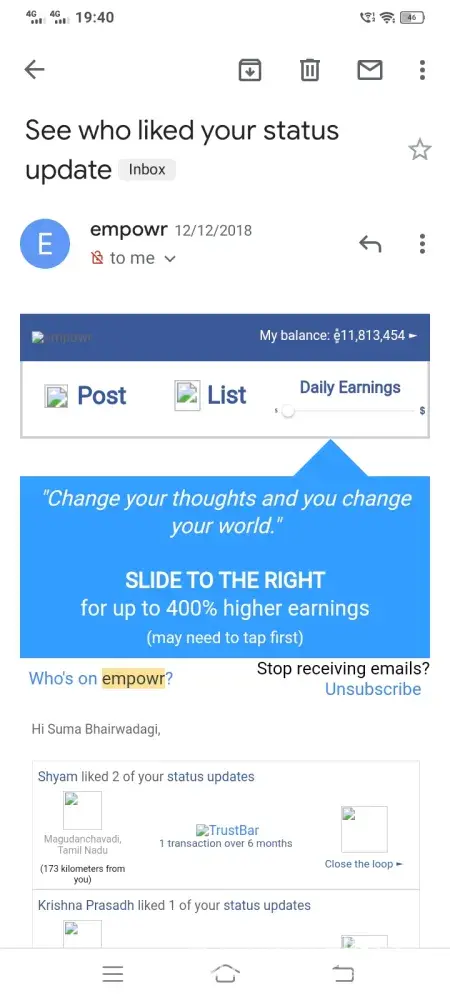 Dear Sir, I am Informed by Empowr Team that My Balance that I have earned is about $54, 987, 099.59 (USD), and I was asked to Cash Out it by Depositing a small amount of $2 in my Wallet, and I Deposited, $3.5..then I was asked to work daily on Post, Share, Bid, and List. and I am doing it, but I am not being allowed to cash out any amount.Generally, it takes 3, months for cash out what they Said, but this is more than an Year. so what to do..solve this