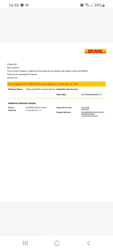 On 13.06.2021 DHL send the package back to Germany, so I completed the form to request the deposit back, but nothing happened.
