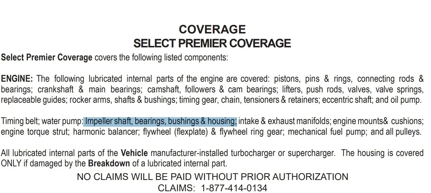 On Feb 27, 2023, I took my 2014 ram 1500 to the dealership for a water pump leak. The warranty company I have, Endurance, was notified on 2/28/23 by the service technician that there was leakage coming from the shaft and the water pump needed replaced. The claim was denied by Endurance saying the bearing is a wear item. The Service Advisor contacted me and let me know this, so I called Endurance myself. I was advised the same thing from their claims representative. When I asked where in the contract it states a bearing is a wear item, he stated that the pump would have been covered if it failed, but a bearing is a wear item and not covered with the warranty I chose. I then read through my entire policy and found in the "Covered Items" on page 4 of my policy, it states"... water pump: Impeller shaft, bearings, bushings & housing...". I can not locate anywhere that states a water pump bearing could be considered a wear item and thus not covered.