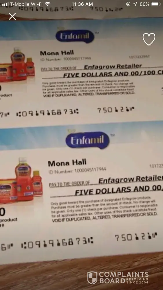 Sick of seeing people illegally selling checks or reselling formula samples! Enfamil should take her off the list immiedietly and send your coupons and checks to someone who actually needs them and will use them in the way they're meant to use. Stop supplying checks and samples to scammers like this woman!