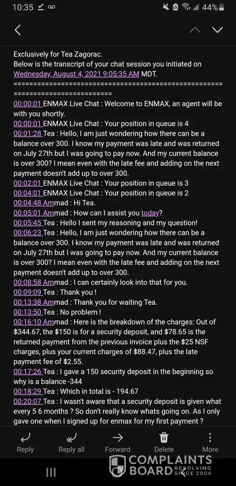 My name is Tea Zagorac and I started an online chat with Ammad due to the overcharge on my Enmax bill. As I tried to explain my situation the agent ignored what I have said and ended up disconnecting from the chat still making me pay the overcharge which was over 300$ and my bill was only 80$. There was no implication where I showed aggression nor violence and I have a transcript receipt to prove the entire conversation.