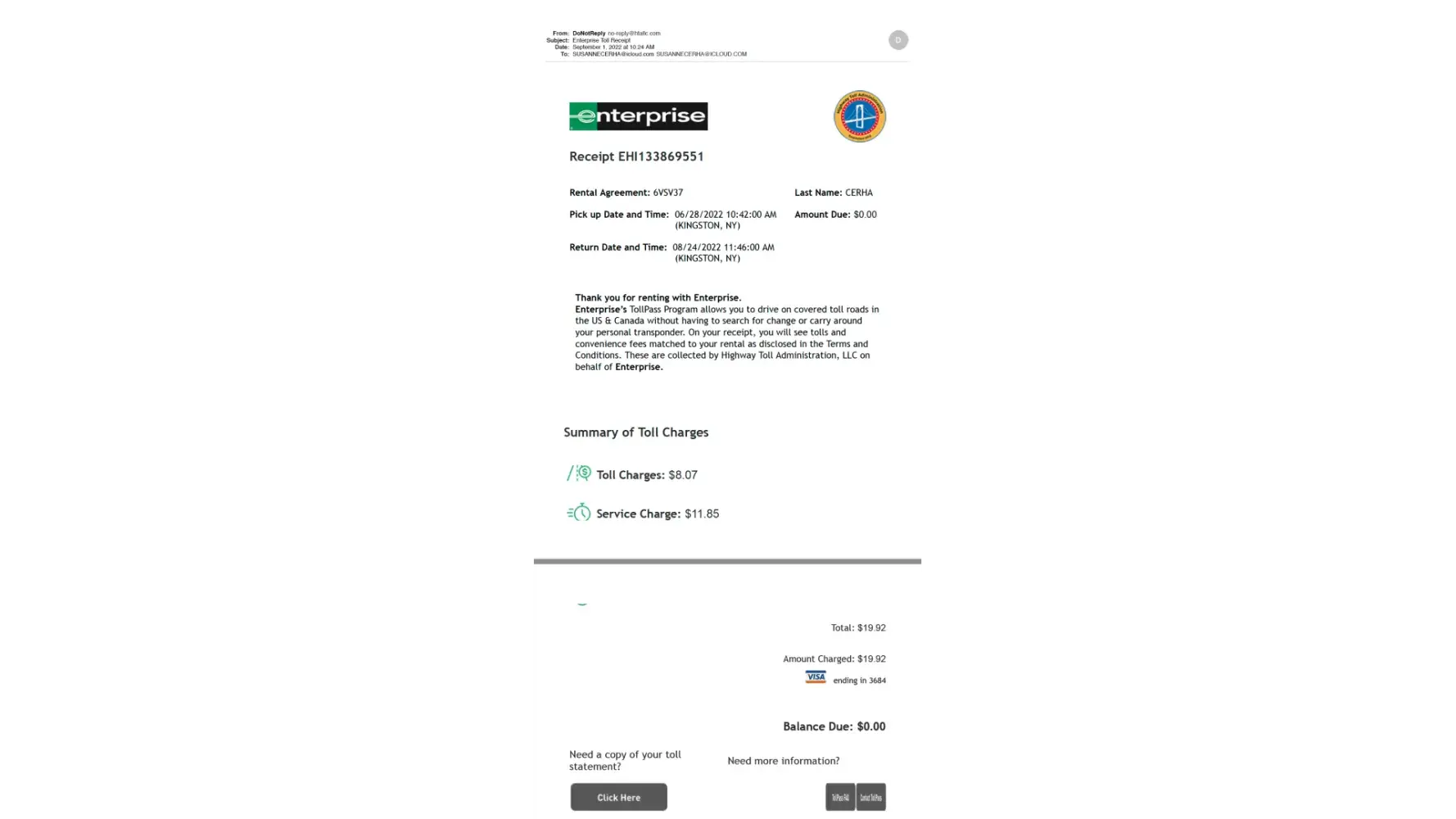 It has been over 10 days since returned the car, and today we got an email from '[protected]@htallc.com', claiming that we owe $8.07 in tolls, and $11.85 in service charges, for a total of $19.92.