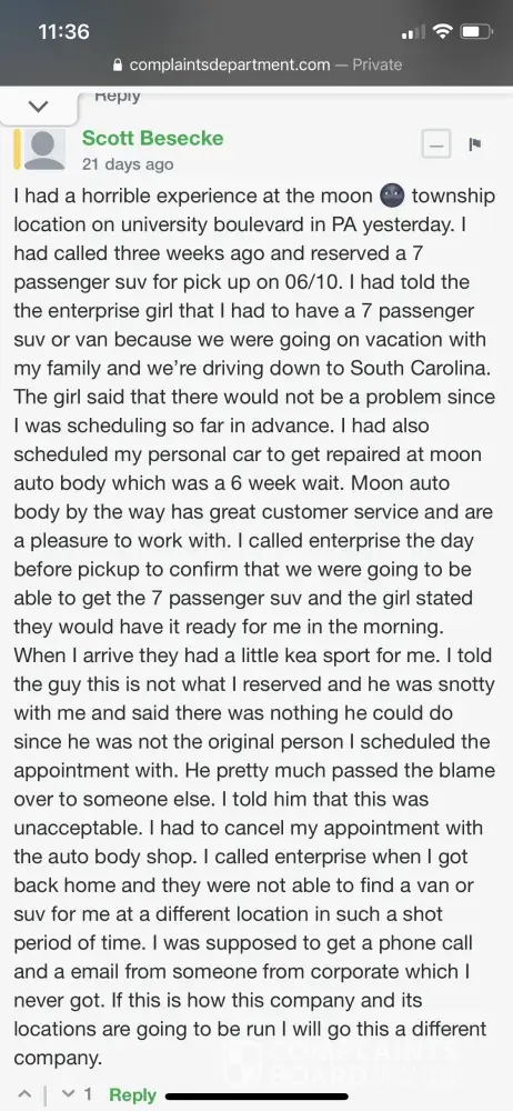 I am writting this because I have not received a response to my previous complaint. Attached is a picture of the complaint I posted a few weeks ago. I used to love using enterprise rent a car, but after this last experience I doubt we will ever use them again due to the moon township locations incompetence. Their incompetence really messed up the beginning of my family's vacation. They really put all of us in a bad situation. Below is a picture of the original complaint I left.