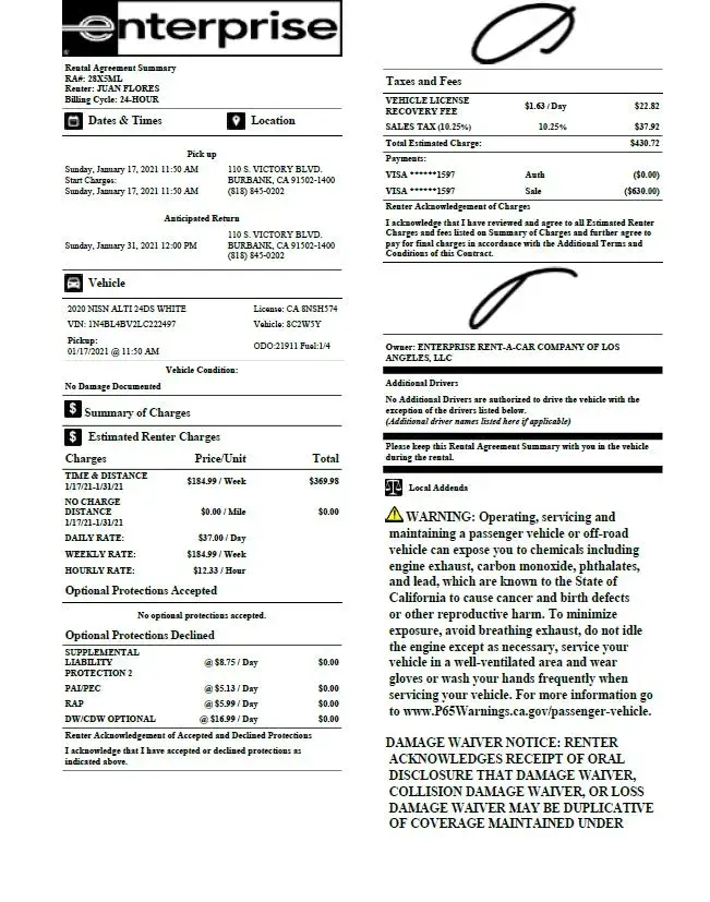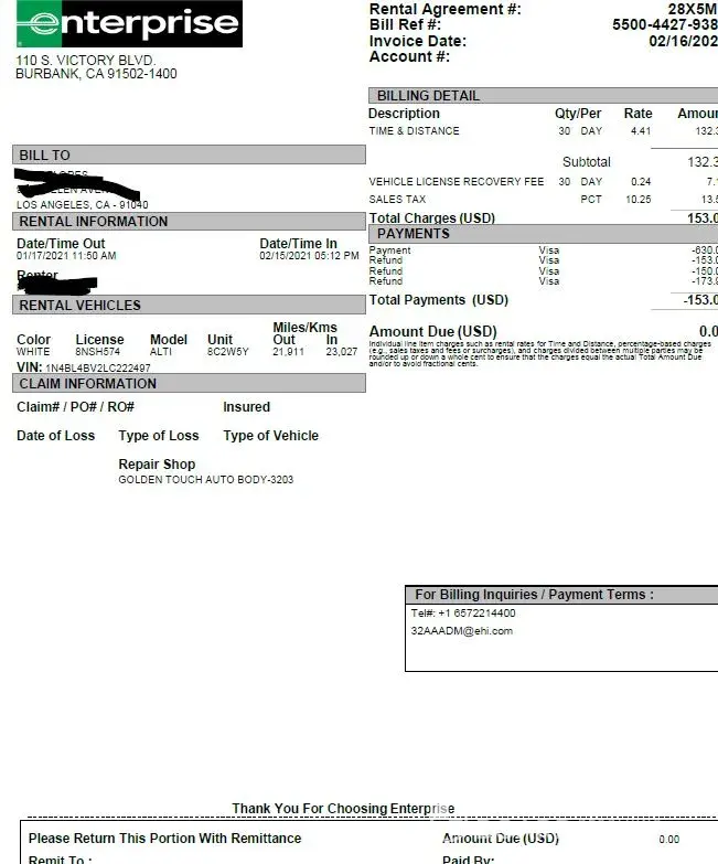 I was recently in a car accident and needed to rent a vehicle. I rented a car from Enterprise for 15 days starting January 17, 2021 and signed an agreement to pay $430.72 including taxes and fees. I was charged a deposit of $630 and was told that I would be refunded $530 once my insurance company approved my claim. The remaining $100 would be held until I returned the car in case there were any unexpected charges for fuel, etc. And, it would be refunded after I returned the car. First, the deposit was not returned to me as described. I had to call Enterprise to request the refund on 3 separate occasions, and each time I was assured the refund would be processed only to find a coupled of days later, that only a partial refund had been credited to my bank account. This is already an issue but not the reason fro my complaint.