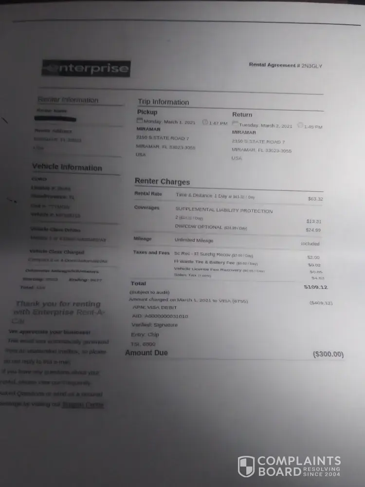 On 3/2/21 i rented a car from 2150 S State Rd7 it was a 2021 red Toyota Camry they didn't put the kind of car it was i took video's of the car before i left while the saleman was doing a walk around with me no damage and when i brought it back with no damage and i took pictures when i took the car back at they location and that salesman did a walkaround and told me i was getting my 300 deposit back but i recieve a reciept like enterprise was trying to do a fake claim in my name and i was at enterprise when they rented that same car i return to another customer and i saw her drove off in the car. I never received that type of receipt all the years i rented from Enterprise because it says bill to with my name it has the vin number on it doesn't have the last 4 numbers of my credit card. and it says i was getting zero money back and i t says remit this porton at the bottom to enterprise Leasing company i never lease a car from Enterprise only rented and the longest i ever rented was in 2017 was a week my last car i purchased was on 2/14/2014 a red 2013 Toyota Corolla from South Dade Toyota of Homestead in Homestead, fl but in got totaled from my car accident on 6/27/2020 and. i have Gap Coverage from Toyota and the lien holder is SantanderConsumer usa. anit nobody doing a fake claim in my name and when i called and ask about that fake document they was trying to explain i called the Customer care and let them know and they wanted me to do a review on Google or Facebook because they didn't like my last complaint. I told customer care i cant do any postive review i rented in the last three months and each time i had to make a negative review and then they decided to give me a different receipt showing the last 4 of my credit card and with my deposit