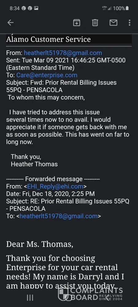 I have spoke with multiple people at Enterprise to no avail. I also received a letter/affidavit from the company I work for stating what type of car I drove and also how many miles (the mileage on the Enterprise website does not match my trip)