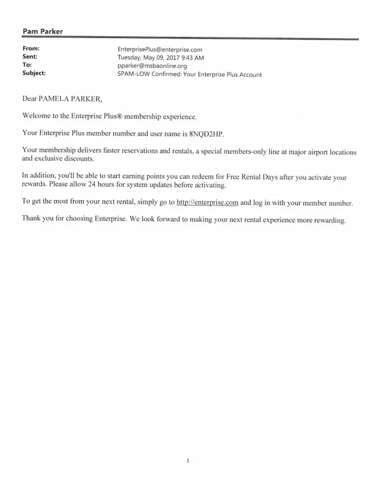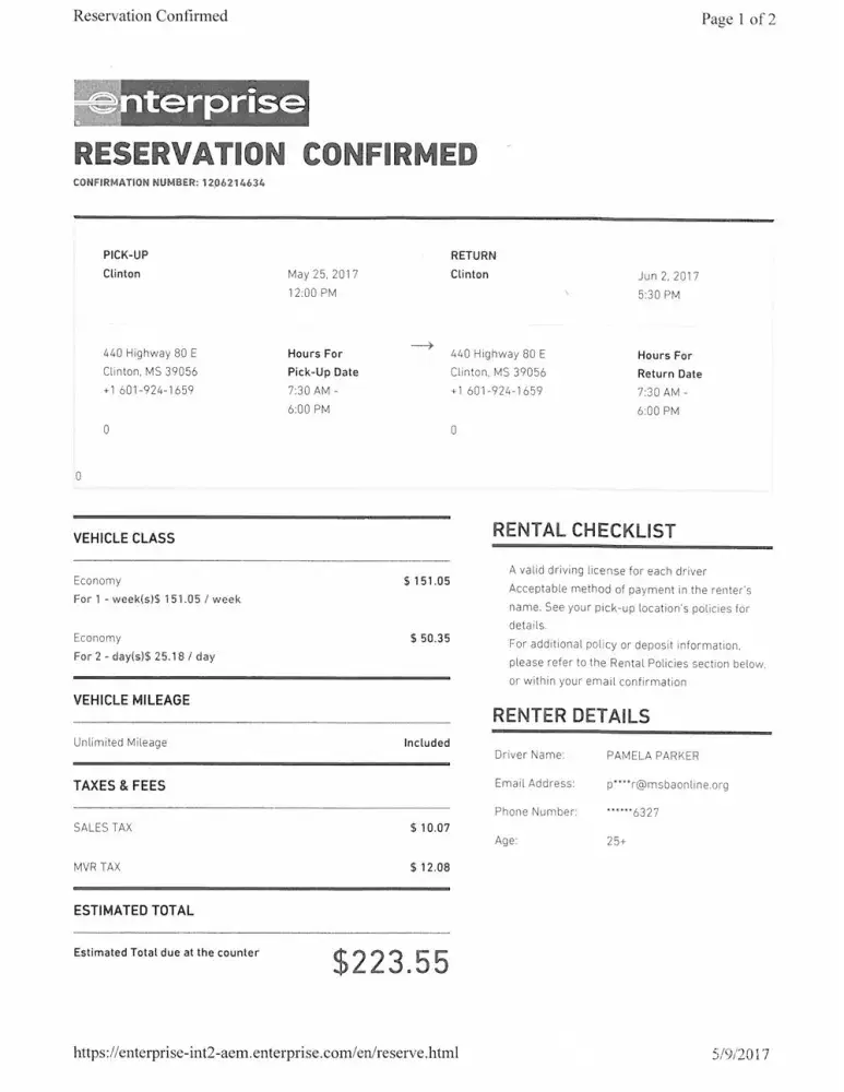 I (Pamela Parker) went online to place a reservation on May 9th, 2017 for a economy car. I got a email to my email address at [protected]@msbaonline.org