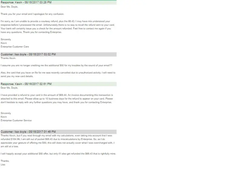I rented a car from Chicago from July 4th to July 29th 2017 from Chicago O Hare Enterprise. I got an initial receipt the first day of rental. When I returned the car on the 29th I agreed they can email me on my final receipt, because I trusted they would do it and do it correctly. I waited a week before I had to email them requesting a receipt. One girl, Amanda, replied with my receipt and I noticed it was approx $178 more than my original, I asked her why, as there was no obvious reasons. She could not explain why and told me it looked like it was because I "kept the car a few days longer than I should" which I did not because both receipts clearly said the same dates 7/4-7/29. I then started to look at the line items and noticed my taxes had increased, which did not make sense. I asked her to explain HOW the taxes were calculated to which she has never responded even after emailing her a few times about any updates. In the mean time another guy, Clayton, had emailed me my receipt (clearly no communication among them either) . He sent me the exact same receipt to which I also asked him why the prices were different, he admitted he could not explain the difference so he refunded me the difference (well he refunded me $185 which was a small bit extra and I don't know why). I was still skeptical about why my taxes were increased, so I asked Clayton to explain HOW they were calculated. He also stopped responding. So, as a person who actually enjoys mathematics, I took it upon myself to work out how the taxes were calculated by working off different and random rental prices off their website for a number of cars for a number of different dates. I worked out the equation and calculated my own taxes, this showed they had still over charged me by an extra $75 on taxes alone (add on the $178 for reasons unknown, I was overcharged a total of $253). I emailed all this to Clayton, asking him to review it and refund me what's rightfully mine. I have since not heard back from him, even after emailing asking for an update. So my next step was to just send in a complaint form to a generic Enterprise email. A guy, Kevin, did respond to me and was understanding and helpful. I did not go into as much detail with him about my calculations but did explain about being over charged. He did not ask much. He noticed I was already refunded $185, so he offered me a courtesy $50 for my troubles. This would have been great, yet I would have still been out of pocket by $18! Enterprise still owed me $68 for miscalculations on the taxes(as they gave refunded me $185 instead of $178, $68 this was they remaining difference), so giving me $50 "for my troubles" still did not even cover what I was overcharged. So I replied saying yes I would gladly accept his offer of $50 but I would actually like to be refunded my $68 also that was rightfully my money! He replied with "I refunded your $68 but now I cannot give you the courtesy $50" . Great, I finally got my money back that was rightfully mine, but I don't understand that one minute he can offer me compensation for my troubles but then when he refunded what was rightfully mine he can no longer give me compensation for all the trouble I just went through? Disaster of a company. I'm sure so many people are over charged and don't realize it. As a customer, we expect our charges and taxes to be calculated correctly and honestly. No one usually checks their receipts line by line, but they should start! I will gladly help anyone *for free* by looking at their receipts and calculating their taxes correctly if they feel they were not right! I finally got my refund after 3 weeks of emails to 3 different people, but to be offered compensation and then to be told they can no longer give it to me was a slap in the face. I was awarded ZERO compensation for all the trouble I just went through to get $253 back that I was overcharged with. Treat your customers right, Enterprise. You just lost 2 customers and I will definitely tell my story to as many people as possible.
