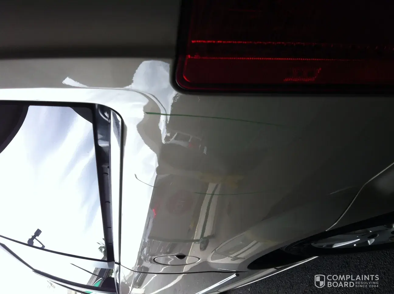 I asked my wife to see if she saw any damage. She attempted to climb onto the back fender but was unable to reach a handhold on the roof without a boost from me to push her up. My wife is also average height (at least 5'5") and she was unable to inspect the roof of the vehicle without assistance from someone to enable her to climb up onto the back fender. She independently inspected the roof of the vehicle and reported that she saw nothing but dirt. She swiped the roof with her finger and again reported that she only saw dirt on the roof of the vehicle.