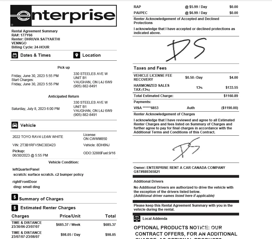 2- While picking up the car I was told to check any damage on body for scratch and dent. There was no scratch so nothing was added to contract.