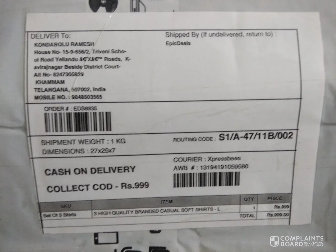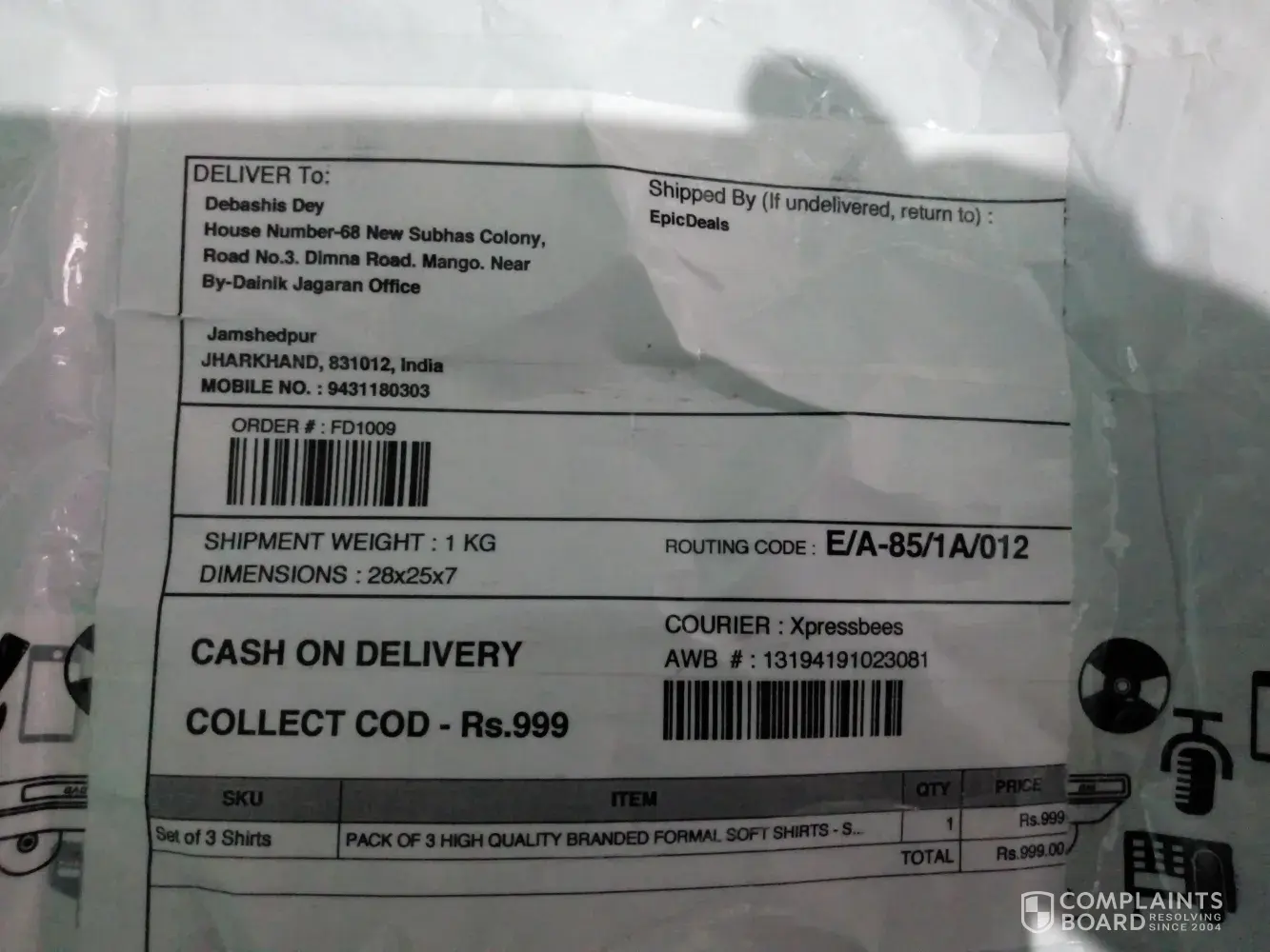 I have ordered 3 shirts from epic deals on 22 Jun 2019. My order ID was EDS10994. It was delivered on 03 jul 2019. The shirts quality was very poor and not at all fit for use. It seems pieces of cloth was mixed and stitched. For the last 5 days I am continuously sending mails to support@epicdeals.com. there was no reply from them. Please arrange my refund of money and pick the items back. The aount was also huge as Rs. 999.