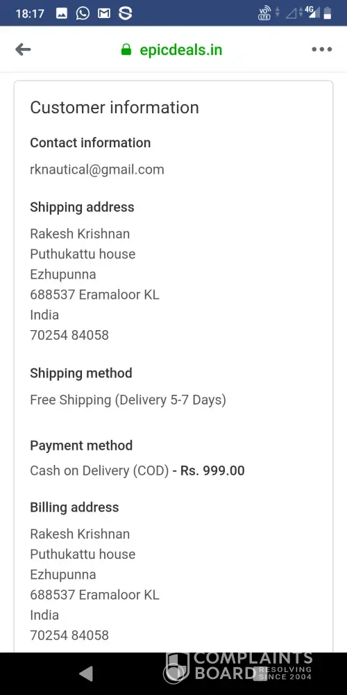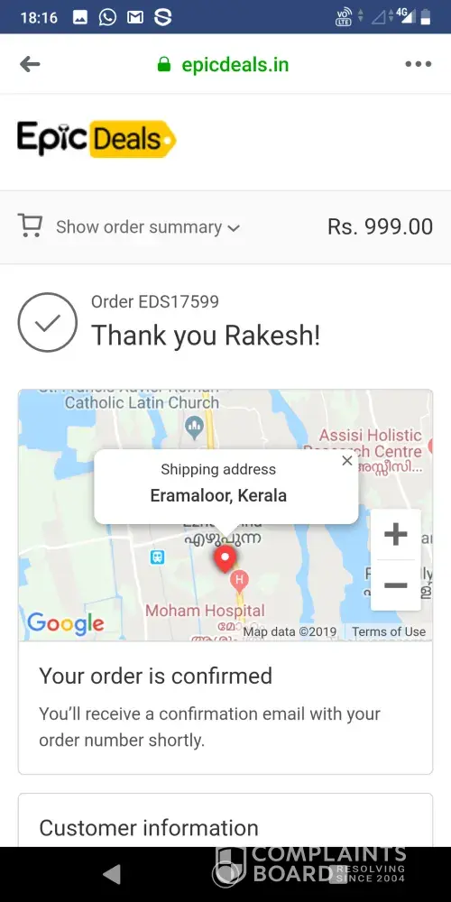 I have explained my grievance to the email address through which I was conveyed my order number EDS14781 but no response. That address is help@epicdeals.in