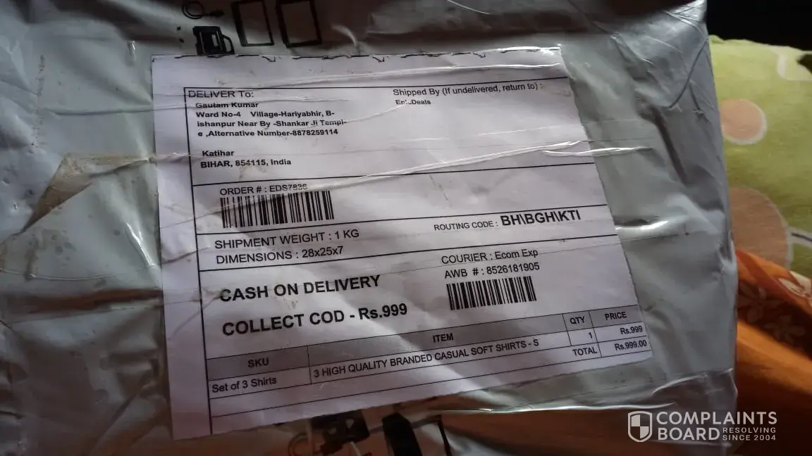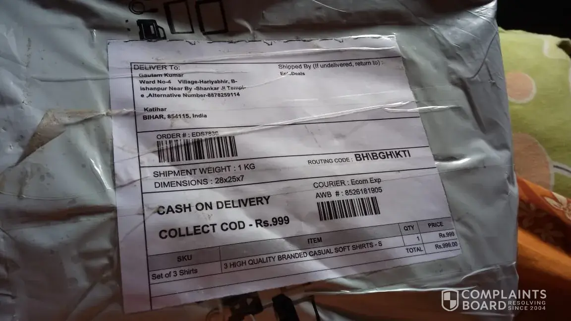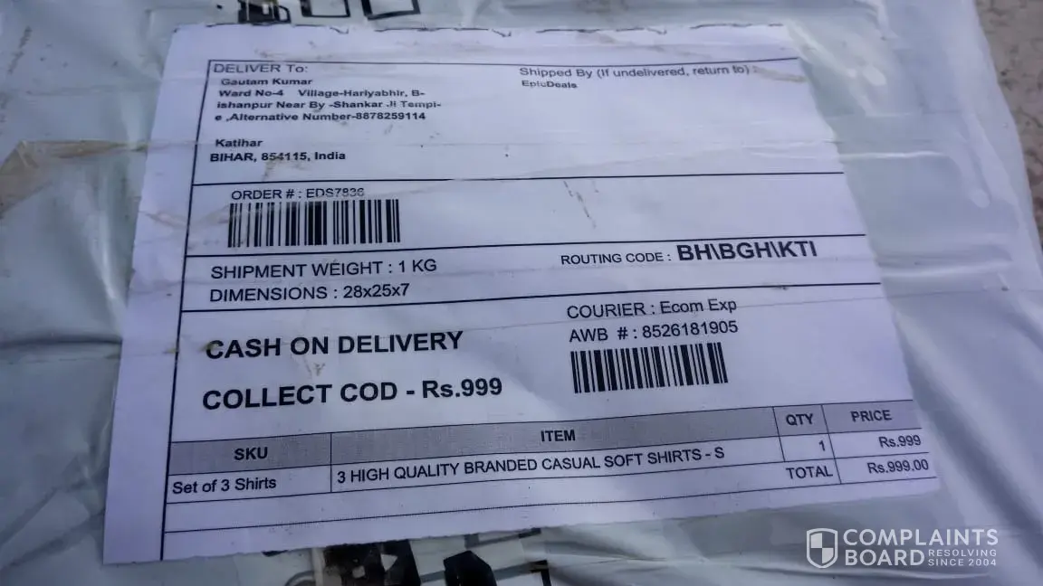I was using Facebook. During that KOUTONS pack of 3 shirts was displayed by Epicdeal. I visited the link and ordered a pack of 3 shirts for Indian Rs. 999/-. The payment was to be made on delivery. They confirmed my order number EDS14781. I ordered for KOUTONS shirts.