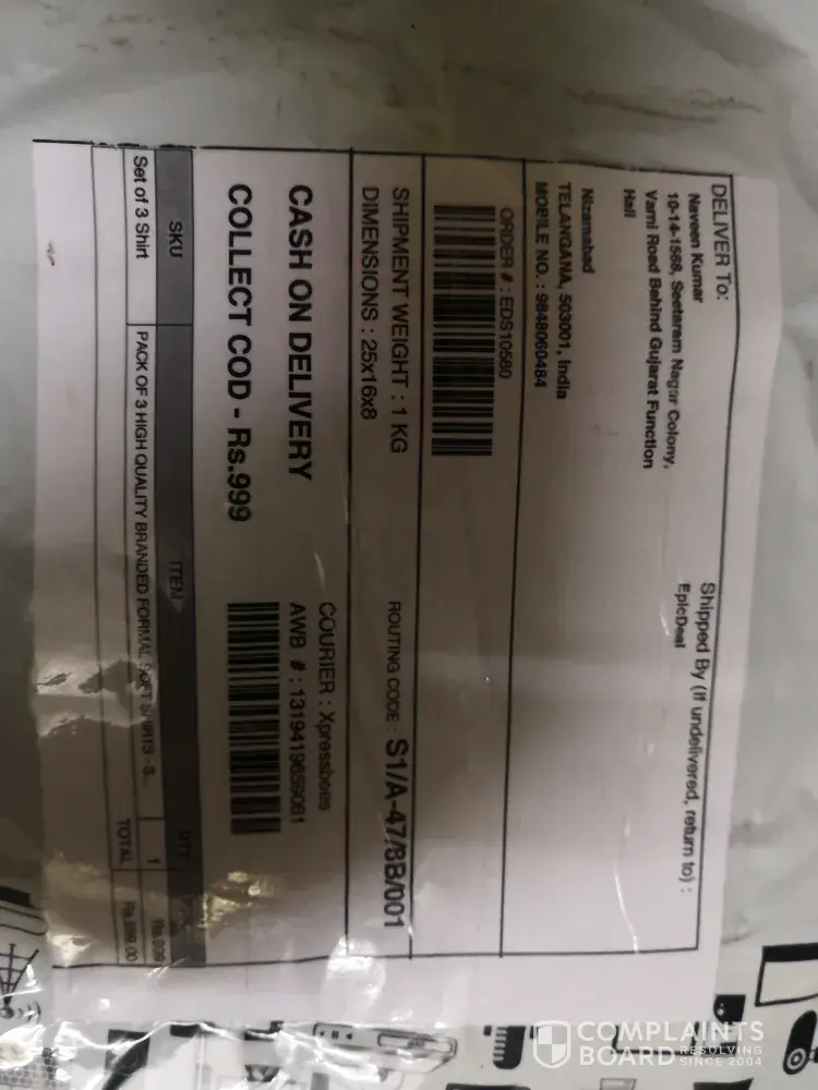 This is Naveen from nizamabad, Telangana State. I have booked one order of 3 shirts package offer of rupees 1000 from Facebook in have seen in one site... But again I am unable to recall that site... I have been cheated that site... I have booked branded 3 shirts but received three cheap quality waste cloth shirts.