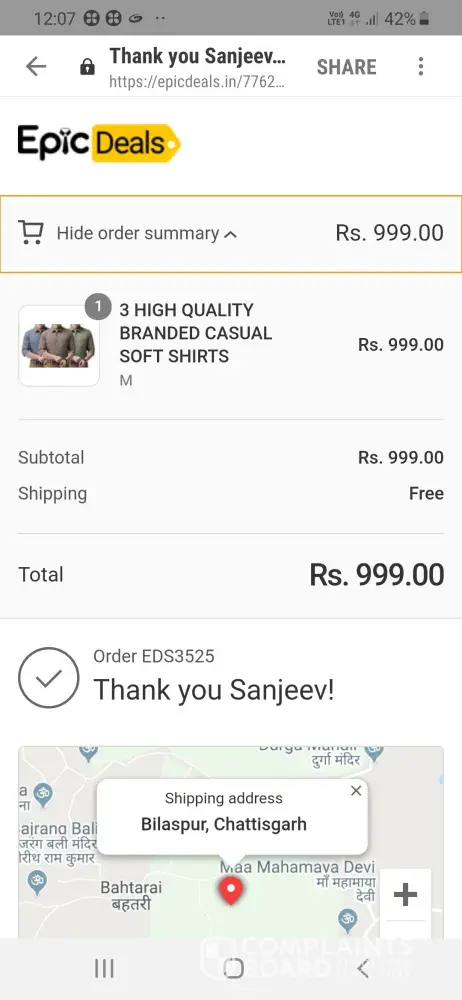 We have ordered shirts 42 size and it has come wrong 38 size Wrong pattern and wrong size.38 Combo of 3 shirts... It is the worst shopping site..please every one Dont buy anything from this site. Every thing is worst... All products are worst. Our rupees has wastes.1000 rs. Epic deal is very bad online shop. i m going to consumer court against epicdeal.in .pict attached and i hav ordered place pic also attached.