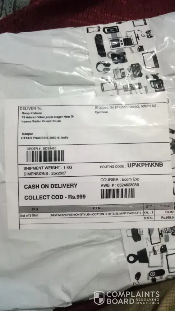 I have ordered set of 3 shirts of kutuons shirts but they delivered very cheap quality of shirts of different brand and colour. If they will not resolve my problem I will go to court. Return my money. My order no. Is EDS12803. Epic deal company has sent wrong shirts as they shown on the facebook.