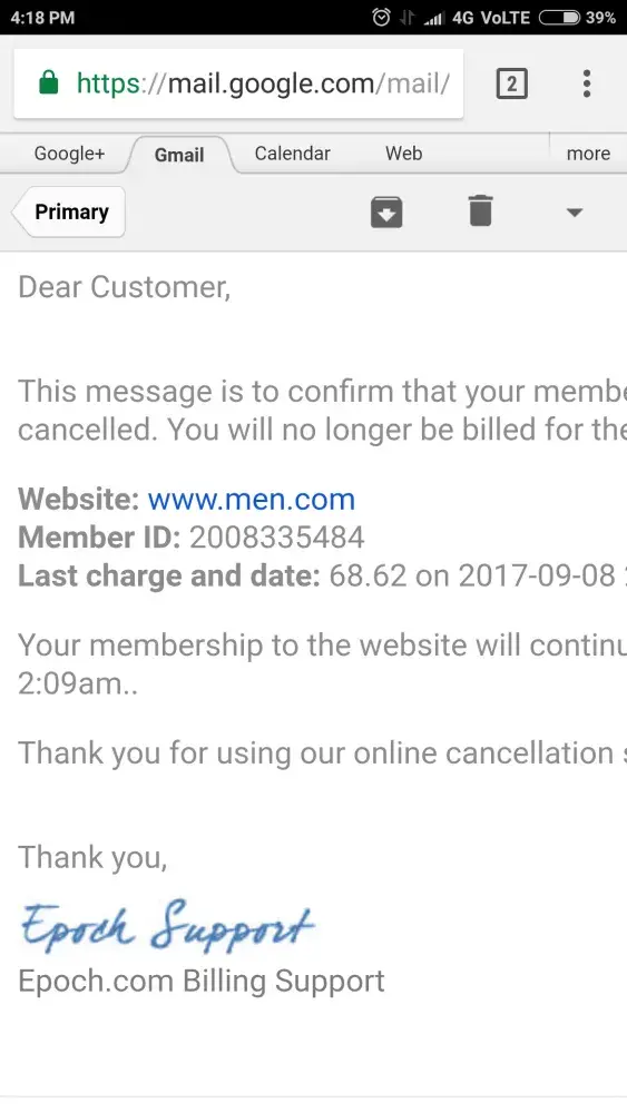 I have had a trial subscription to men.com on 08/09/2017 and thereby unsubscribed it, while the terms and conditions for subscription were that I would be charged on 10/09/2017 next for another month if not canceled. However I canceled it and got confirmation e-mail stating that I would not be charged again and the last charge was only for trial period, then also next months amount was deducted from my credit card, please initiate refund as soon as possible. I am attaching herewith the snap of cancelled membership.