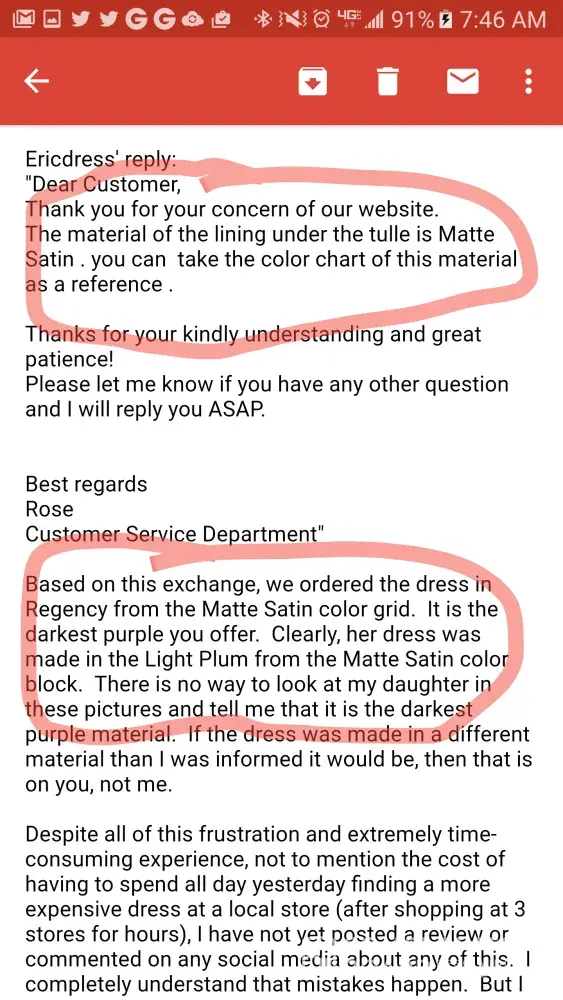 Six communications later, they insist that they sent me the right dress, that it is "fine" and "beautiful, " and offering nothing more than $12. They have not acknowledged the fact that they advised me to use the color grid that I did and that the dress is very obviously not even close to what we ordered. A mistake is understandable, but I have never dealt with a company with such horrific customer service. Buyer beware!