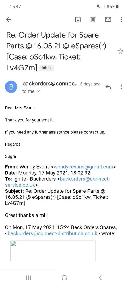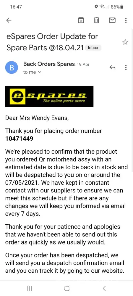 During the course of the following 48 hours I received 2 emails and 2 phone calls from eSpares advising me that they (sales) are following up the matter with their warehouse.