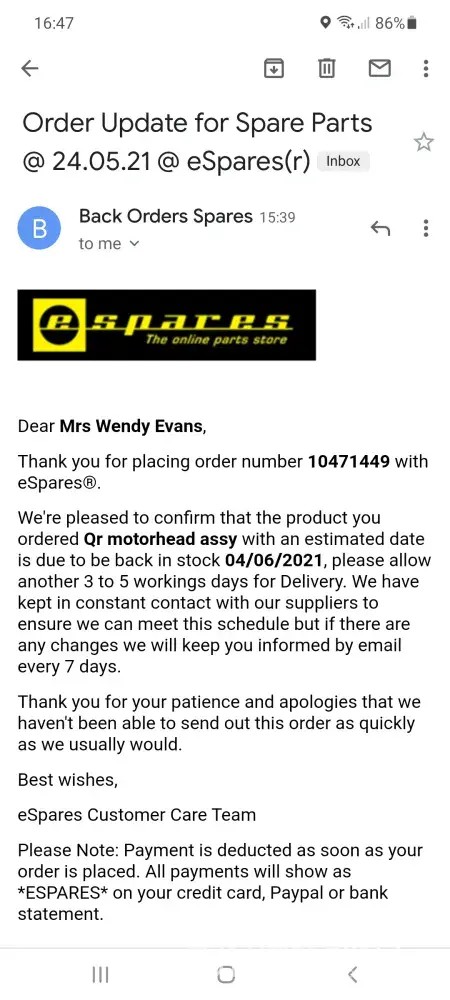 eSpares UK taking payment for parts that are not delivered/ available