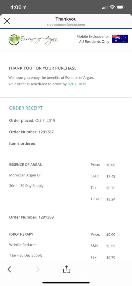 I tried to purchase Essence Of Argan Trial way back in September 2020 and missed to read the terms and conditions. I was billed for the full price of the trial products and then called the company right away, customer support I talked to about this was very pleasant and understanding. She was able to explain everything to me and I must admit that at first, I was skeptical but the way she explained to me everything, I was relieved I am able to get as much discount despite my misunderstanding with them. :)