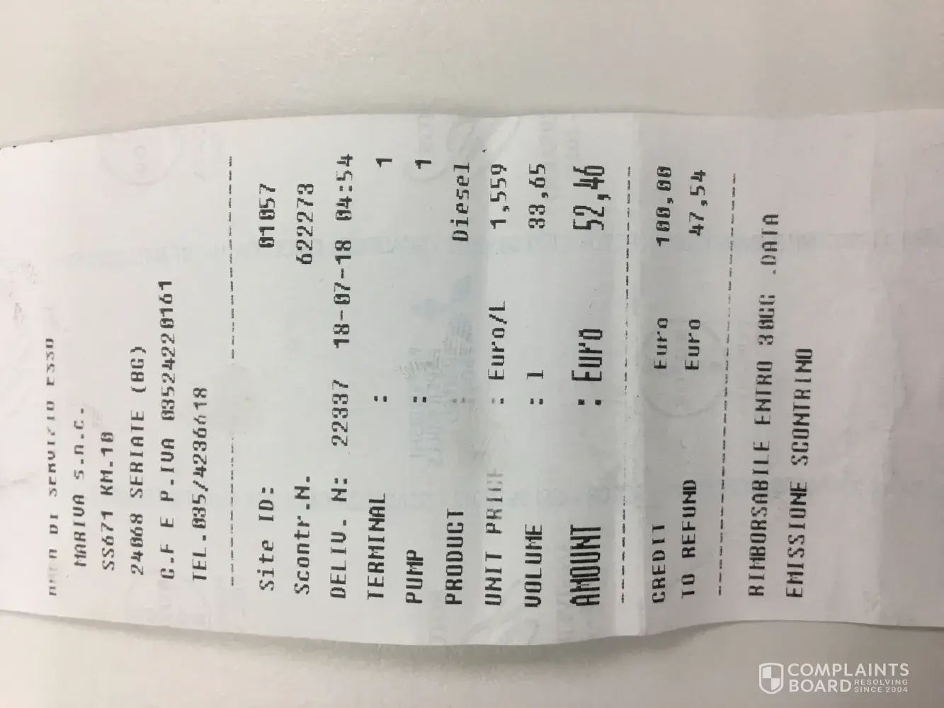 On the 18th 04:54 on the way to the air port to return our rent car full fulled and catch our flights back home, we have used Esso gas station with self service (the station was closed without any real person available), i used 2x50 euro bills on the self service machine (no option for credit card), and fuelled my car with Diesel, with the amount of 52, 46 and received a Receipt with indication on a credit of 47, 54 (no option to get the amount in the station as it was closed and the service machine cannot give refund.