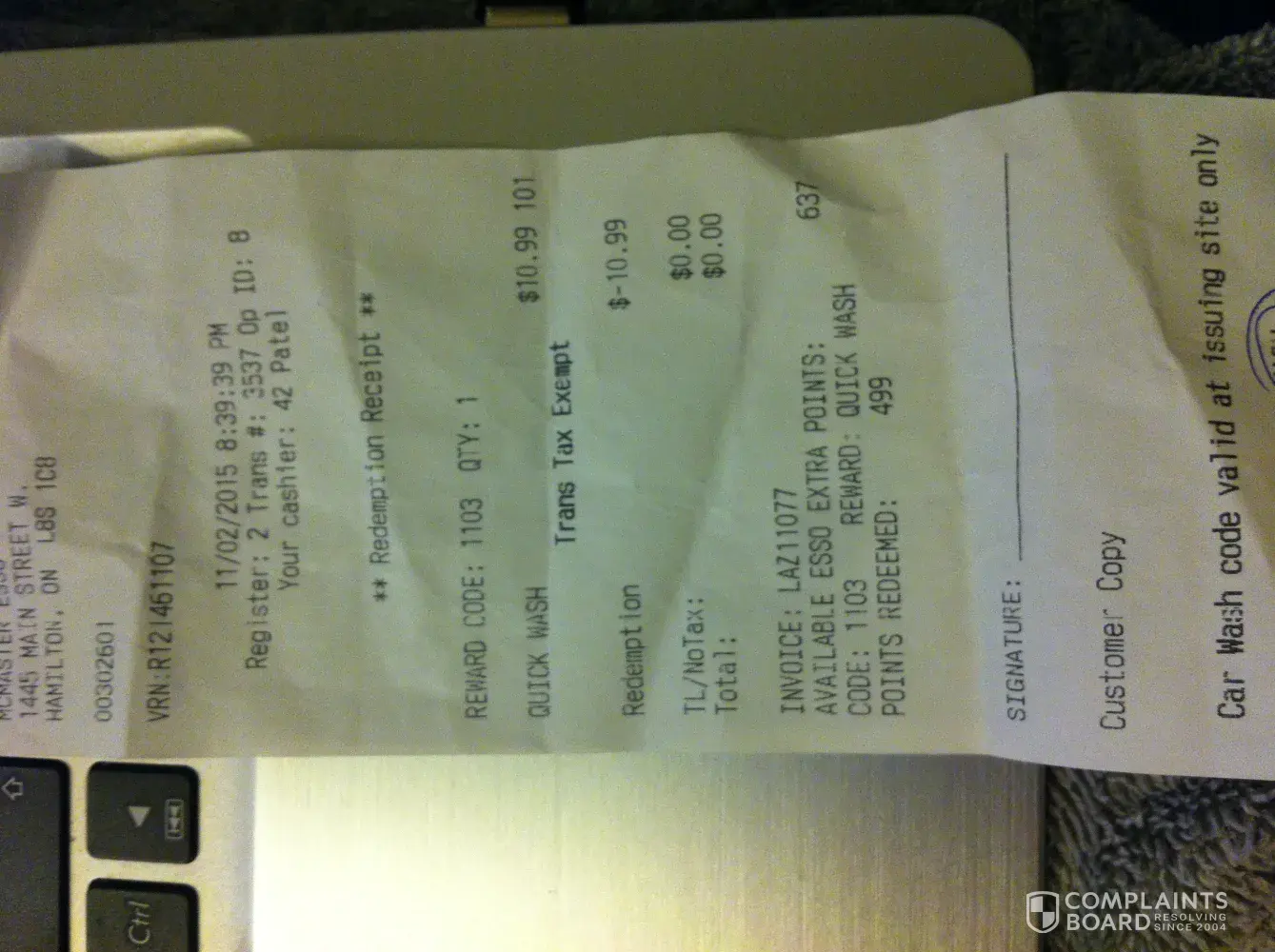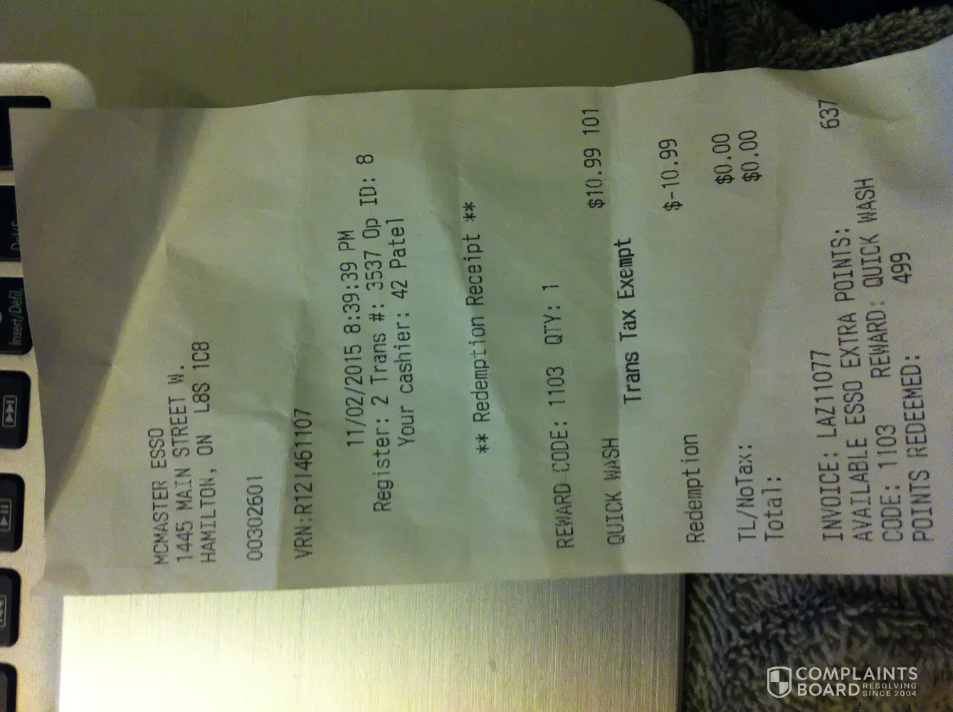 This incident occurred on 11/02/2015 at 8:39:39 PM as said on the receipt. My name is Kalaimathy Gopal, Trans #: 3537. My cashier name is Patel (42 Patel) and the location this incident occurred was at McMaster Esso, 1445 Main Street West, Hamilton ON L8S 1C8. I was pumping gas and it came out to be about 20 dollars (20.01 to be exact). I went to pay for it...