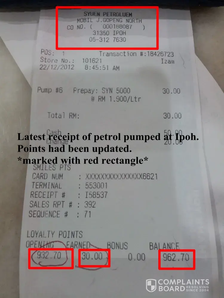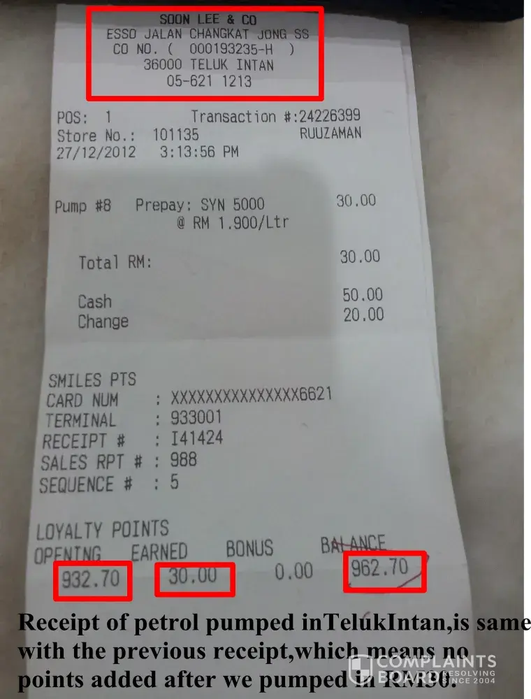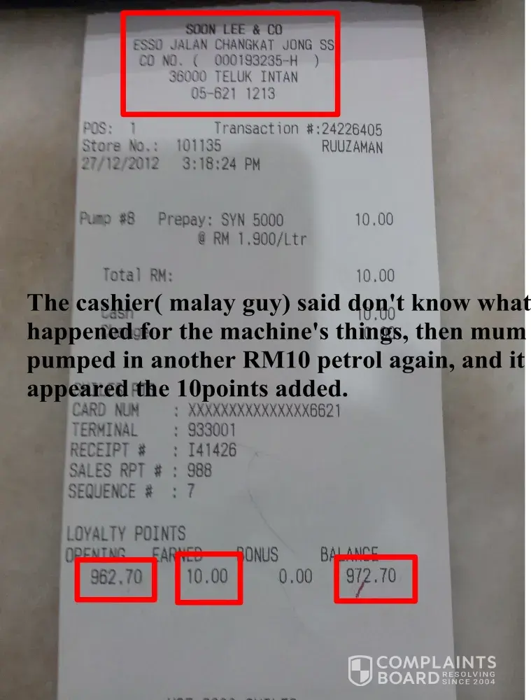 My mummy and I went to this Esso petrol station to pump petrol on 27/12/2012 at 3:13pm. Then after the payment done at counter, my mum got the receipt and back to the car, and she found that the RM30 petrol that she pumped didn't add into the previous point. And so she immediately go to the counter ad asked the cashier, the cashier just answered her that he didn't know anything, and might be machine's faults. Alright, my mummy pumped RM10 petrol to have a testing again, and from the pictures i attached, you can see the 10points was added in. So what's the truth? What actually happened? It was the cashier had cheated the 30 loyalty points. We were here to complaint not because of the RM30 can turn into 30points, it's all because of the employer had hired a very dishonest employee, and the employer asked my mummy to forgive the cashier because Chinese New year is coming soon, they are very hard to hire people again. Please ! This is not a good excuse ! And most terrible is the cashier didn't even want pay an apologies to my mum. Is this the proper manners and ethics an employee should have? You guys really must take a concern on it. Thanks !