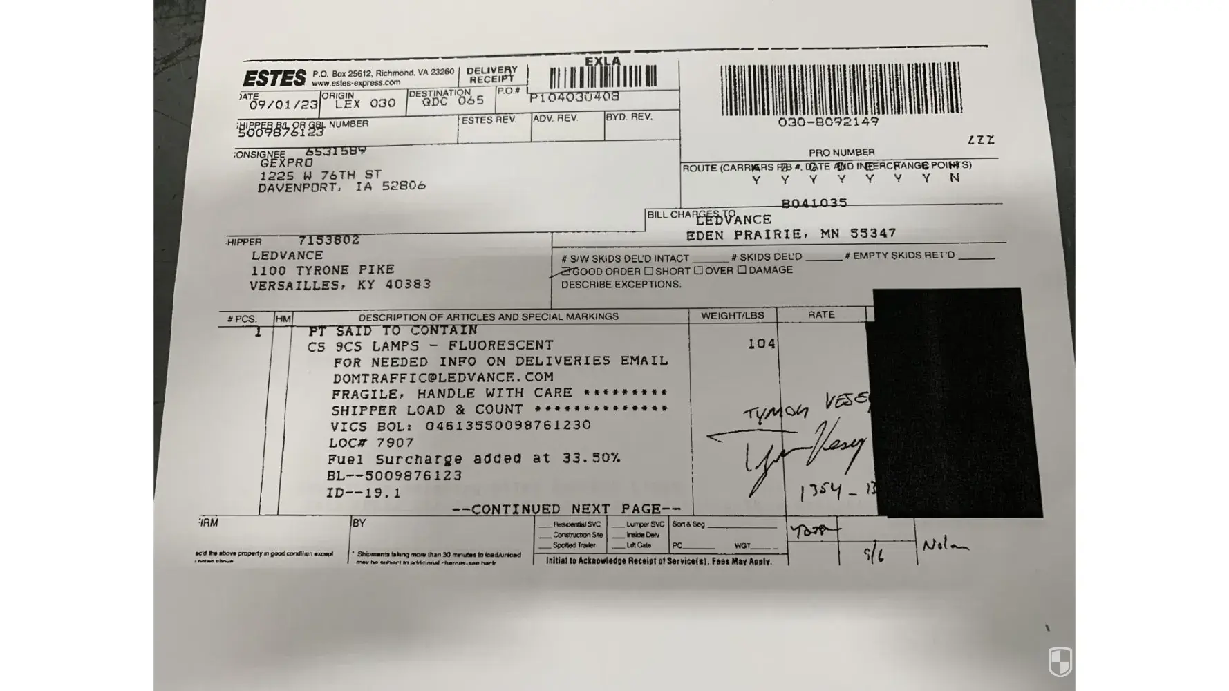 I contacted your company about a shipment and was told that it had been delivered even though I had not seen it. The representative told me that the driver remembered delivering it to us, but still we never received it. I was sent a copy of the delivery receipt which had the signature of someone that does not work for this company. The signature name is "Tymon Vesey" which has never worked for this company.