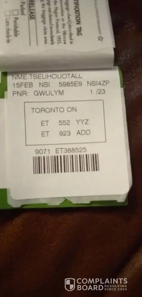 Date of incident : 15 Feb arrive toronto 16 Feb