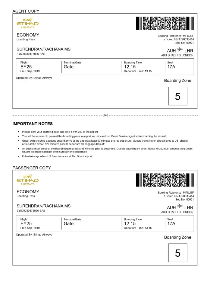Etihad Airways confirmation of seat paid for seat