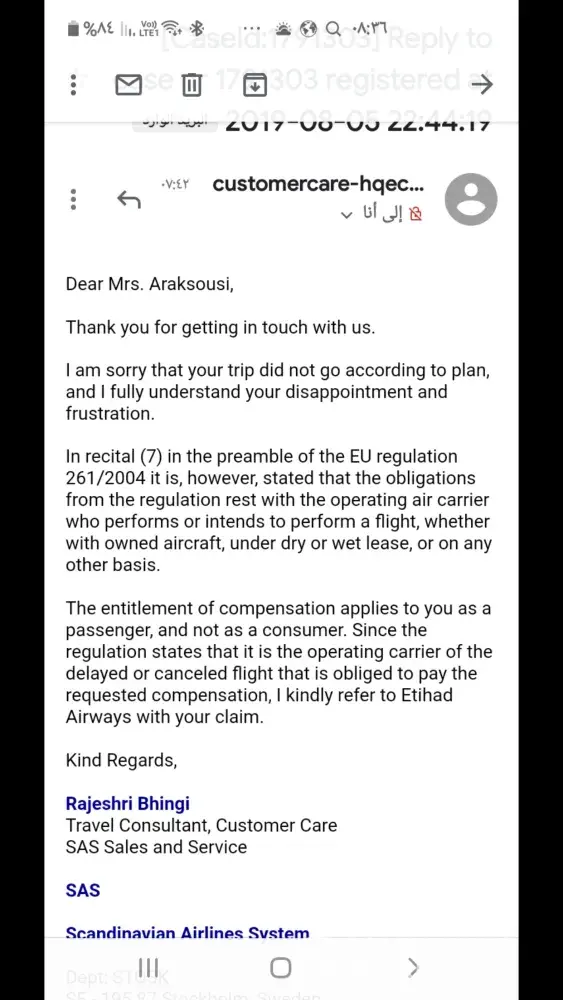 My name is Rimaz Araksousi. My flight from Amsterdam to Oslo ( EY 7342) on 6 June 2019 landed very late in Oslo which caused me to miss my connecting flight from Oslo to Trondheim ( EY 7469) . I stayed in Oslo til next day in order to catch the morning flight ( SK 338) on 7 June 2019 so the delay was for one day and i would like to get compensated for that. I contacted SAS airways nut they referred me to Etihad since Etihad was the operating carrier.