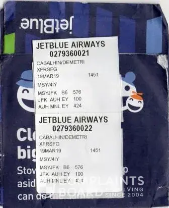 Please be informed i am Demetrio S. Cabalhin Jr. during our port of call in davant USA iv been sent home dated March 17, 2019 during my fligth from new orliens to JFK i have been a delay of fligth for more than 3 hrs. I missed my connecting flight from JFK to Abu Dabi, Jetblue reskedule my fligth to march 19, 2019 and they have arrange me a hotel check in time 2300H March 17, 2019 and check out March 18, 2019. Since my flight is reschedule to March 19, 2019, I have requested one night stay in hotel but they have refuse to give me another one day. They have rebook me in March 18, 2019 9pm in different airline witch is Cathay Pacific. As per above subject my luggage has been missing. Kindly ask your support to recover my luggage in JFK in Jetblue Airlines or in Ethihad Airlines. Please find attach my boarding pass, passport copy and luggage claim stub.