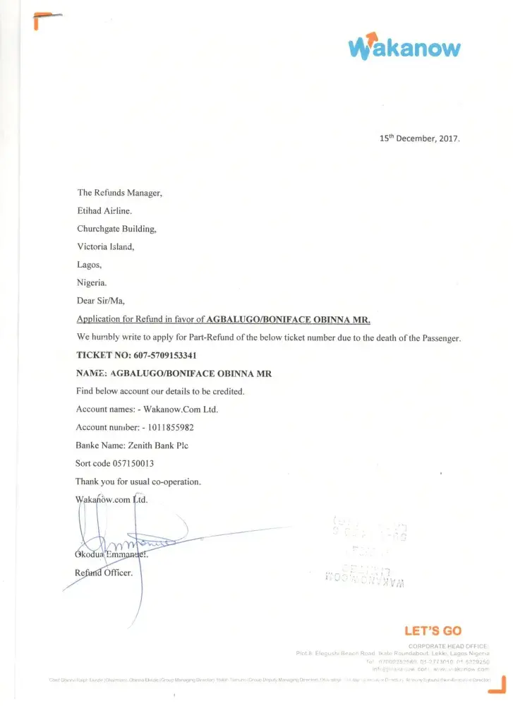 I had filed for a refund on the return leg of my fathers ticket since December last year and have several times pleaded with Wakanow to ensure that my pleas got to Etihad air so that the refund can be initiated since it was a case of death. I sent all the requested documents to them and they assured me that the process was on.