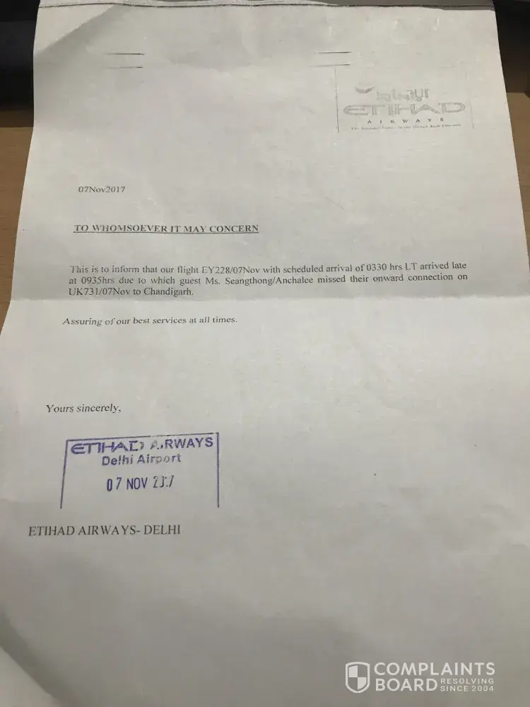 Etihad Airways has left an official reply on this complaint.