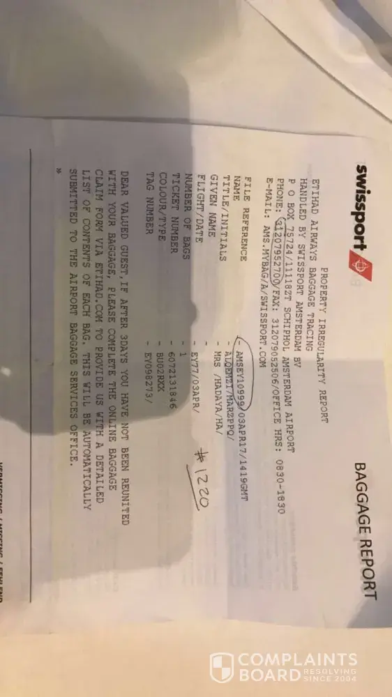 Hi I travelled to amesterfam on the 3rd of April I received one of my bags only and the other bag wasn't found I went and complained to Swissport ( they aren't helpful at all and am being ignored from their side and told that my bag didn't get out of UAE, although I contacted etihad yesterday and they told me both my bags were received in amesterdam, my flight number is ey77/3april, ticket no.[protected], tag no. Ey098273/, name hadaya alqemzi