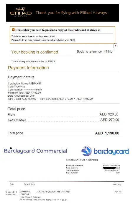 Two days later, our Managing Director was contacted by the Fraud Department at the bank. They informed her that a payment of over R12000.00 had gone through to Etihad Airways.
