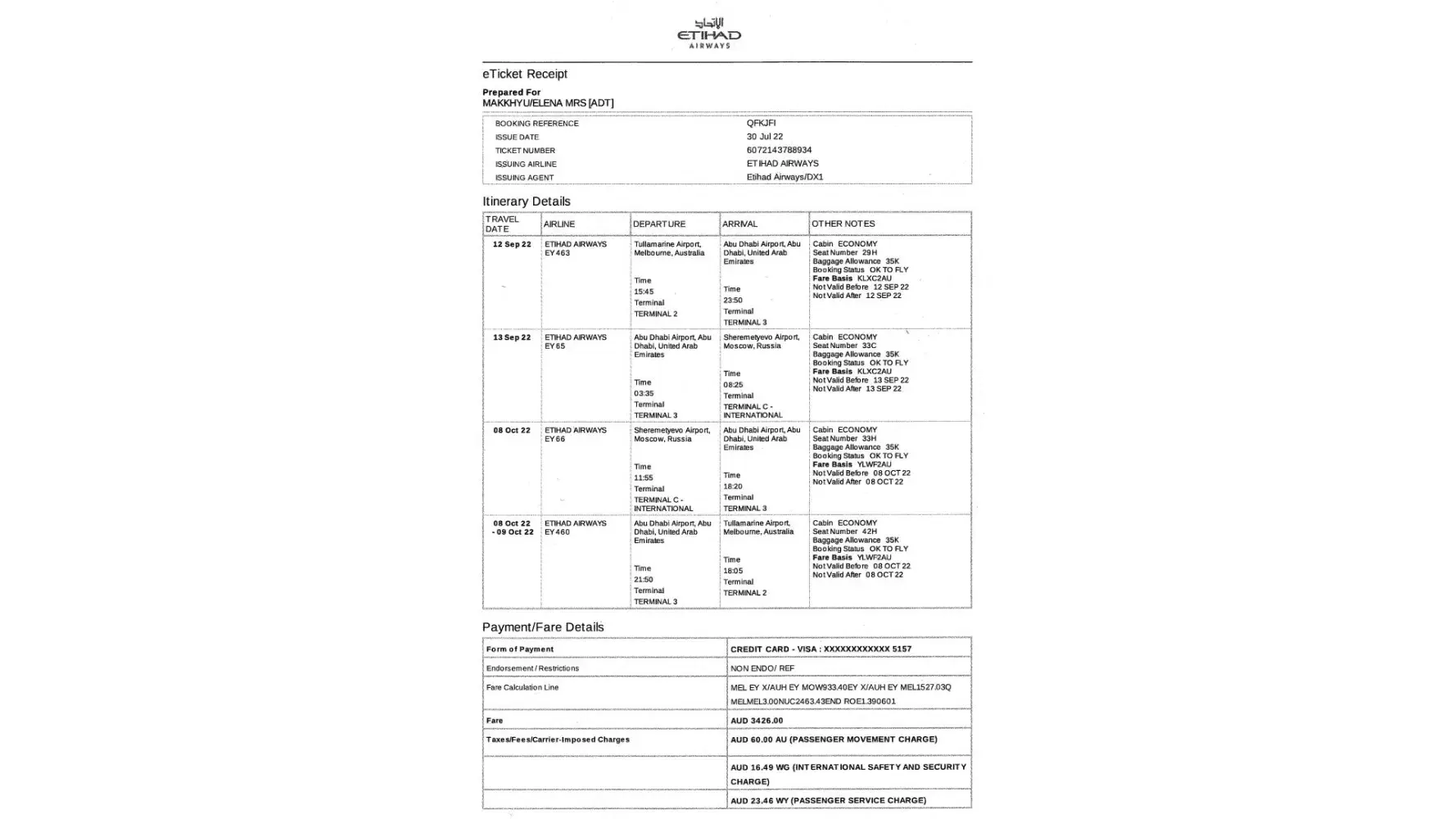 My name is Elena Makkhyu and I am writing you because of the problem which I faced during my flight ETIHAD AIRWAYS EY 460, the 08 Oct 22 - 09 Oct 22, from Abu Dhabi Airport, Abu Dhabi, United Arab Emirates to Tullamarine Airport, Melbourne, Australia, Booking reference QFKJFI. Please, find enclosed my electronic ticket.