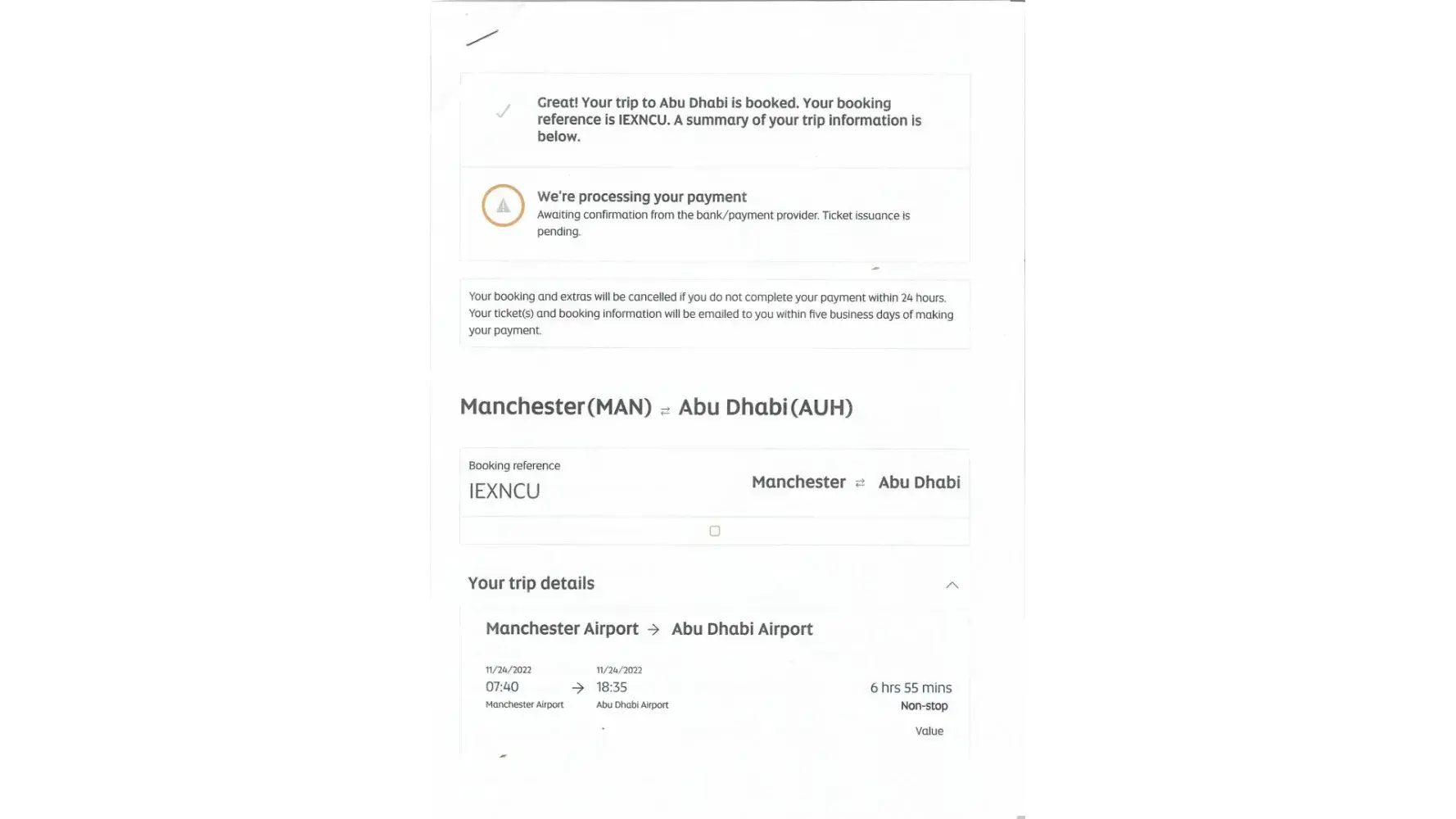 Next I tried direct bank transfer to Global Collect BV (payment reference [protected]) which Etihad accepted and I received confirmation of the booking with a 'Booking reference number IEXNCU (I have attached a copy). The money left my account at 16.30 on the same day (see screensaver of my account page). Since then I have not received any correspondence, emails etc. When I attempt to manage by booking on the Etihad website by using IEXNCU, I get a message that reads 'Something went wrong' (see screen saver). I have checked with my bank manager and the money has not returned to my account so it is somewhere in Etihad.