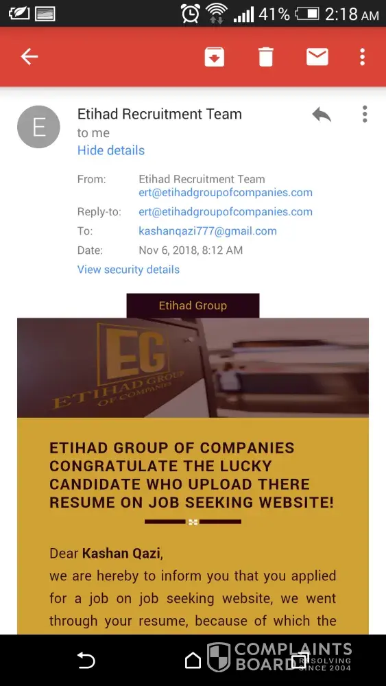 Kindly tell me is it fake or real... I received email and also sms on my cell number about job offer by etihad group of companies. Pictures are attached about details of email address from which I received Email. And I received email from ([protected]@etihadgroupofcompanies.com)