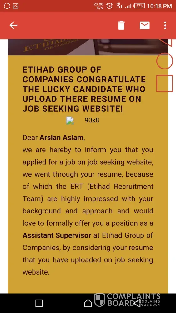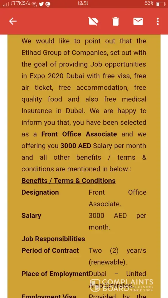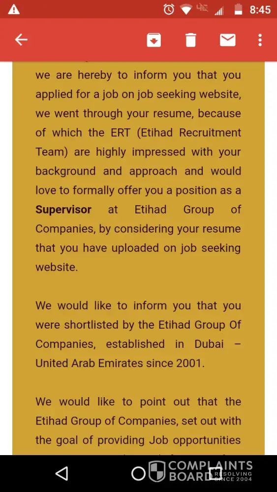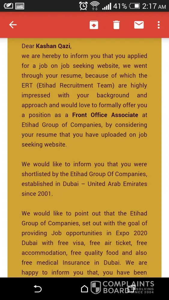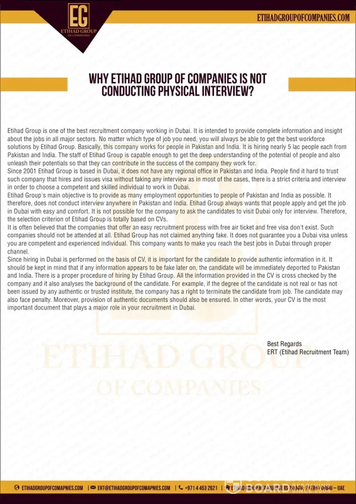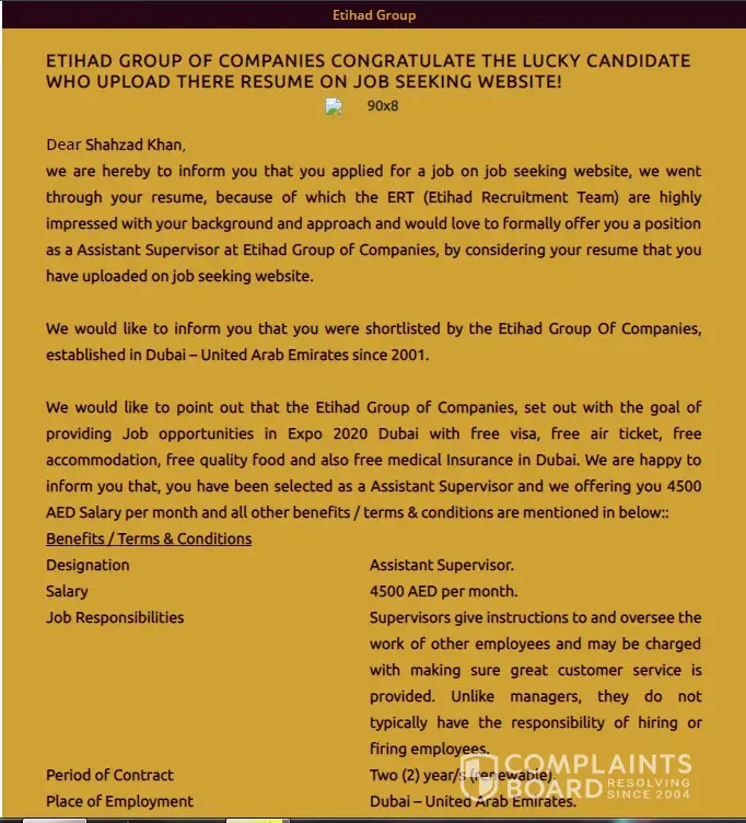 I'm from pakistan and today i received email job offer from etihad group of companies and also an sms on my cell number to check the mail they sent to me.There was a contract offer for me to do the job of Assistant supervisor within salary they are willing to pay me 4500AD monthly with all many company employee benefits.They mentioned that the job designation is affiliated under the project of dubai expo 2020.The salary doesn't match with the posting and i am also a fresh graduate in civil engineer.Therefore i checked on internet social media and found mass of negative reviews.There is no one got appointed that i may had verified now.I found it my duty to report it towards ISPR or FIA in pakistan to stop these scams of detaining personal information for illegal purposes.