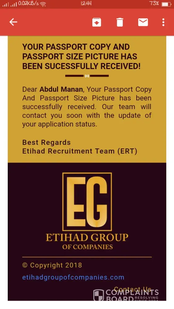 Dear Sir i received fob offer from Etihad Group Of Companies when i search this is fake so i don't provide my documents for further process please safe the peoples from this fraud and aware the peoples as soon possible this is so near to genuine way of fraud .