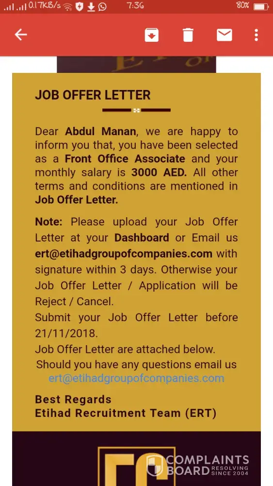 I received a job offer 5 days ago as a supervisor at Etihad Group of Companies at 5500 AED per month. I was wondering whether it is a real or fake job offer and as I started to investigate. The doubt begins from the point that the email that I received did not mention name of the job seeking website that I applied through. I got up to this website and now I believe it's not a real job offer.