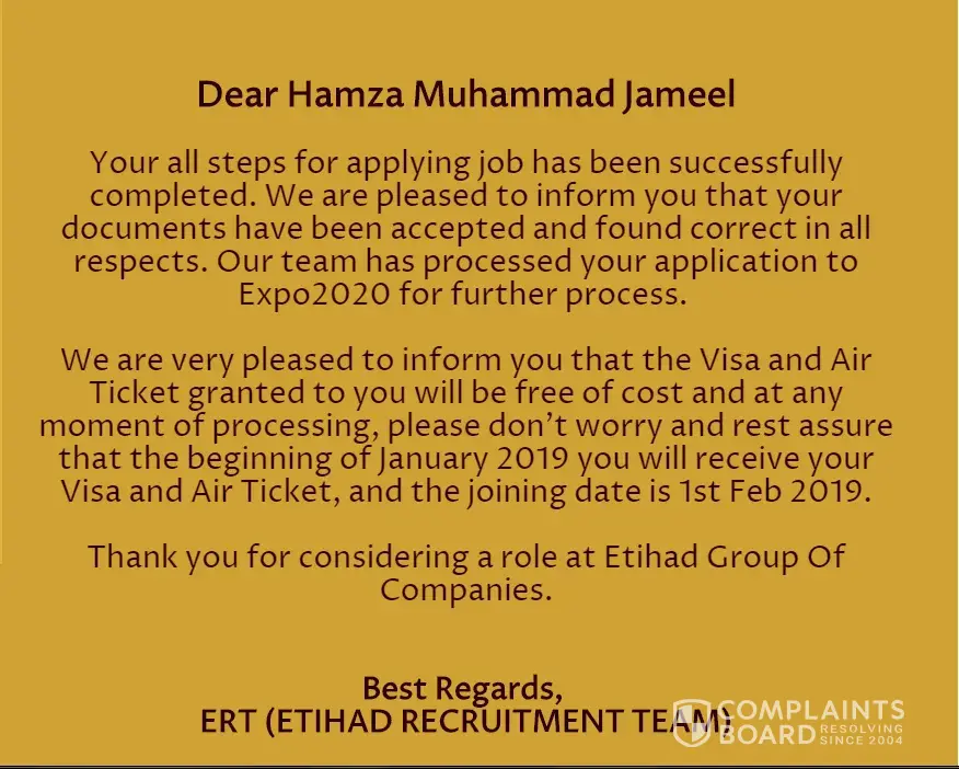 haiooooo plzzzzzzzz remain away from "etihad Group of companies", its a complete fraud, here are the proofs, i have some little bit cyber security knowledge and i spend my 3 hours to unmask their evil face. 1-) On their website they said that their company establish in 2001 but actually if you search the list of companies establish in Dubai you will found that their is no company establish with the name etihad in 2001 in Dubai, 2-) The location which they have shown on a map on their website (in Contact us) is actually not exist if you search through google map 3-) Most of the images and content is copy pasted from this website https://www.transguardgroup.com/ 4-) They offer jobs for Dubai 2020 expo but if you visit the Dubai 2020 expo website (https://www.expo2020dubai.com/) and see their partners list then you will know that etihad group is not included 5-) When they send you a job offer through email then initially they will not demand any money from you but the scanned copy of your passport can be used for illegal purpose. 6-) They are actually trying to make you fool by using the name of Dubai 2020 expo 7-) Remember that Dubai expo 2020 is an original event and is going to happen in 2020 october, it will be a hub of innovative ideas and technological advancement 8-) Agar in logo ne app se money ke demand na bhi ke tu bhi ye aap ko kafii nuksaan pooncha sakte ha by using your passport and other information (especially passport info) for illegal purpose, bas zara inke fraud karne ka tariqa kafi professional ha jis ke waja se logo ko phansana mushkil nai
