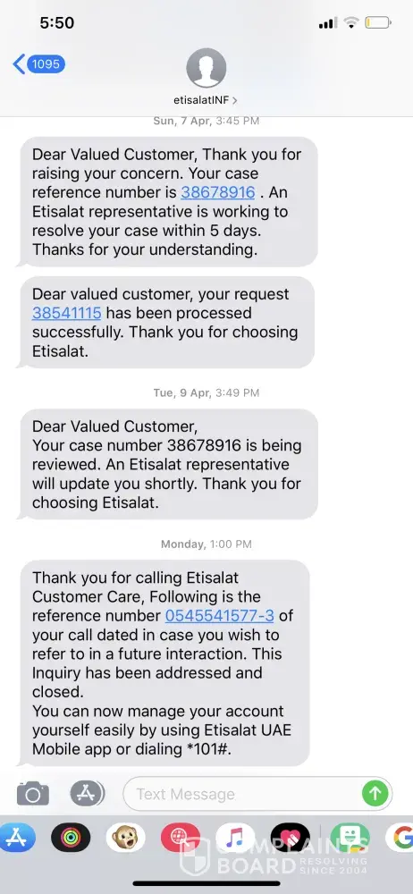 So I have taken a elife service from etisalat, on the month of november for home service from them. Out of a sudden I have to go back to my country as soon as possible. So I had gone to the business center in ibn battuta mall in the etisalat department. When I reached there the agent cleared all the bills on 21st march 2019 till the month of march. And she had mentioned that all the bills are settled. And you have nothing to pay as it even reflected on the system. I will be posting the picture of the receipt too below. So on 30th march she had told to give a confirmation so I had called them on 30th march itself for the cancellation of the home services. And they confirmed me with so and said it will be done in a week. On 7th april i'm getting a call from them saying to make more payments. I told them that the agent said to ke before that the payments are already cleared and I had paid the exit charges also. But still they are insisting to pay. So I registered a complaint on the agent who told me on 21st march that the account are cleared already. Today after a month of daily conversations with them. They are still not giving me a valid reason for me to pay the amount. The pictures that I have attached is of both the reference number and the copy of the bill, received by the agent name and the platform where I was sitting.