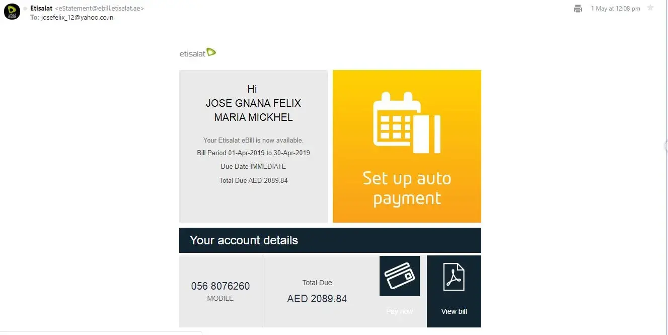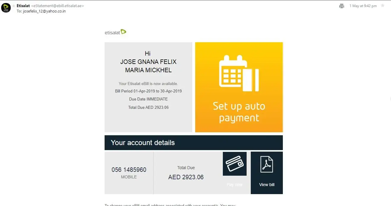 I have received a message on my ethisalat mobile no.[protected], stating that Payment not received AED 937.46 FOR ACCOUNT NO.[protected] from etisalatINF on 12th of August 19:54 hours. I kindly request to look into this matter & I do state that [protected] is not my mobile number & account. So I kindly request you to take action immediately & find the person who is using the above number, or kindly find out if my emirates ID has been misused.