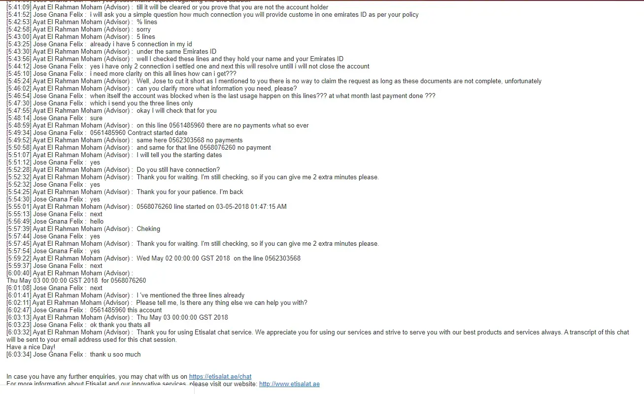 I sent all the chat proof to [protected]@etisalat.ae & [protected]@etisalalt.ae, but no use, they simply closed my compliant, without informing me, i came to know yesterday by calling 800101.