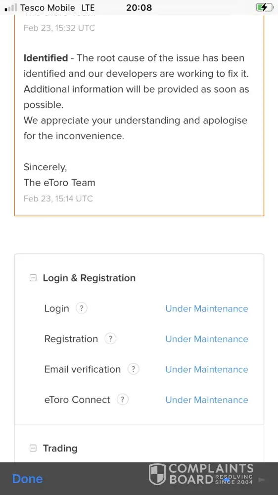Today was one of the day of those several time that i was unable to log in to etoro website to trade and check my portfolio, etc.. they claims that the site was under maintenance during a volatile trading day. This happend many times already in the past. After us market opened they shut their website again, i am unable to even send them a complaint as the website refuse to fo it. (See photo attached) I always been using their app from my mobile, so this time it's something new. They have an offline option to CLOSE my positions, but I don't see details about the current stock price, it seems that they want to make me to close them which I won't do as i know that i am in negative right now. I saw many their users complained in etoro's forum. Something very fishy here...