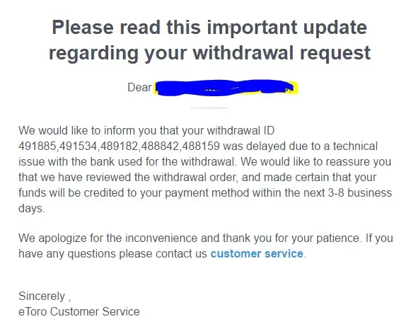 I told my account manager about that, then I've received email from etoro telling me that there was a technical issue and they solved it and I will receive my withdrawals in 5-8 business days.